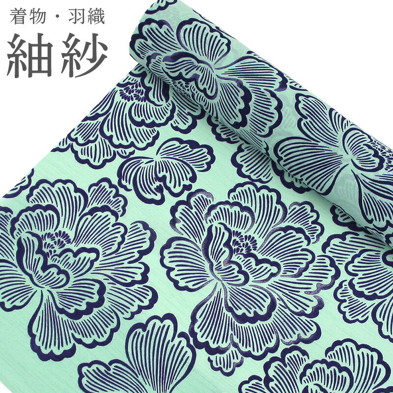 夏物 紗 洗える着物・羽織 道中着 お仕立て代込み 単衣着物 洗える夏着物 小紋 反物 紗紬 薄黄緑に牡丹の花 パープル【TT】
